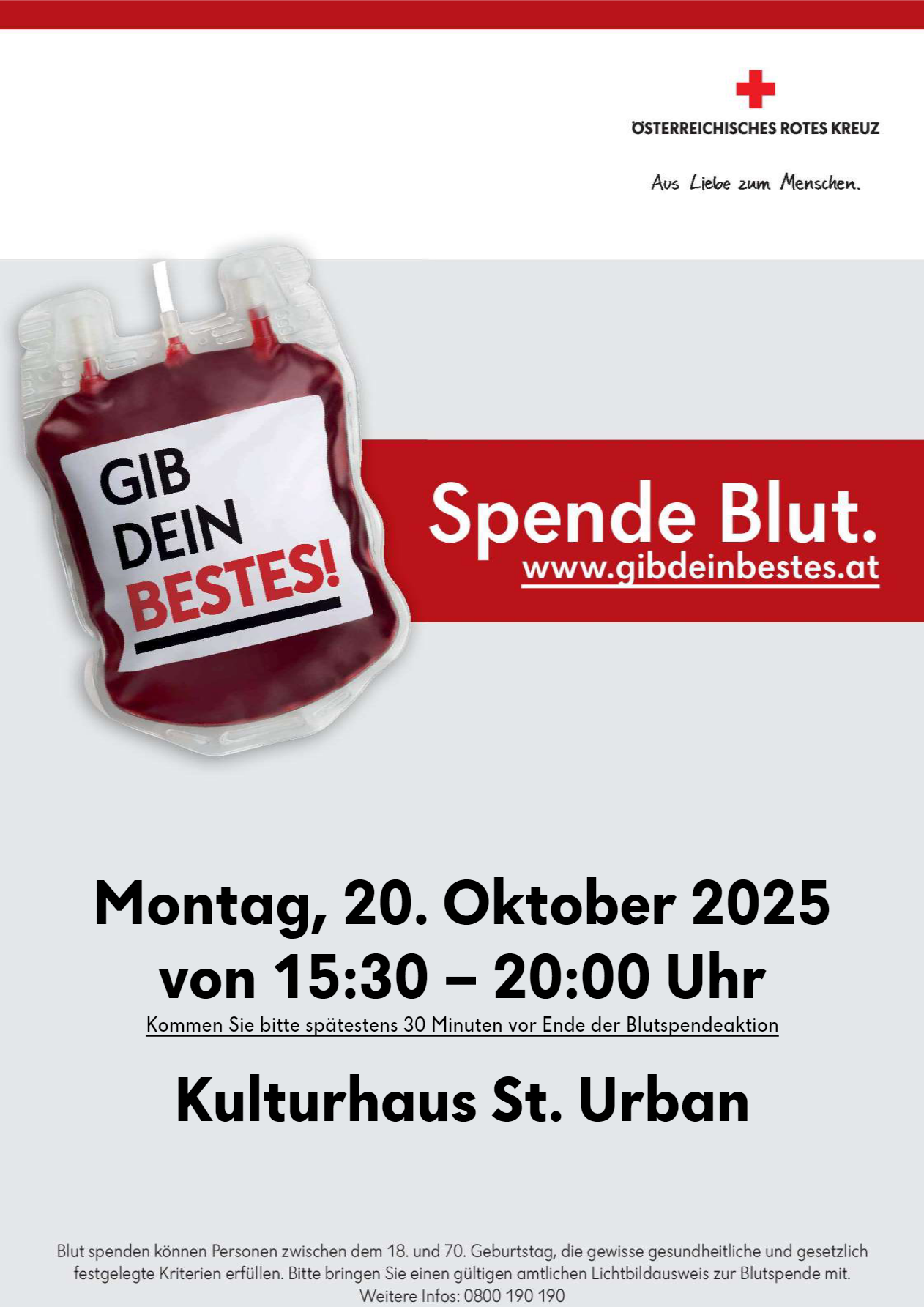 Am Montag, 20. Oktober 2025, laden wir Sie herzlich ein, im Kulturhaus St. Urban Blut zu spenden.