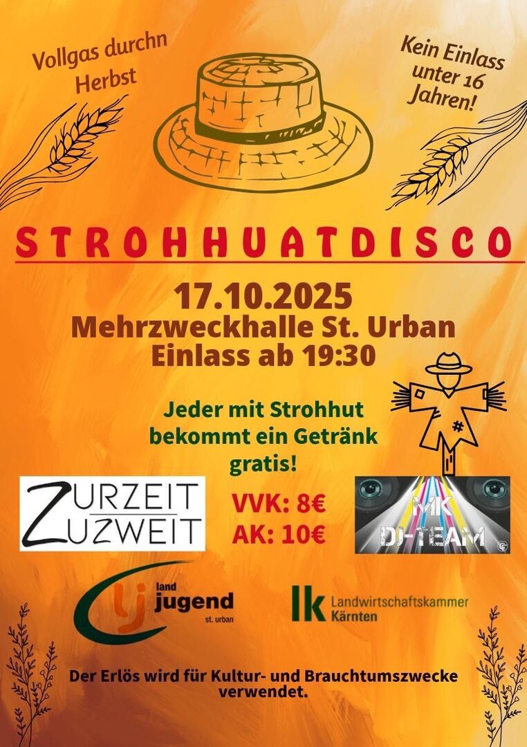 Am 17. Oktober 2025 ist es wieder soweit – die legendäre STROHHUATDISCO findet in der Mehrzweckhalle St. Urban statt! 🪩✨