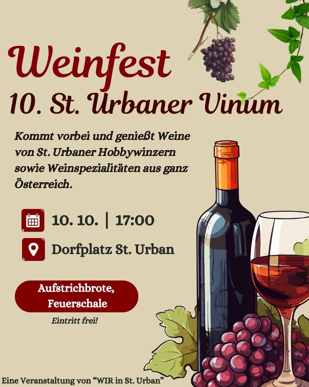 Am 10. Oktober ab 17:00 Uhr laden wir euch herzlich zum 10. St. Urbaner Vinum am Dorfplatz St. Urban ein! 🎉