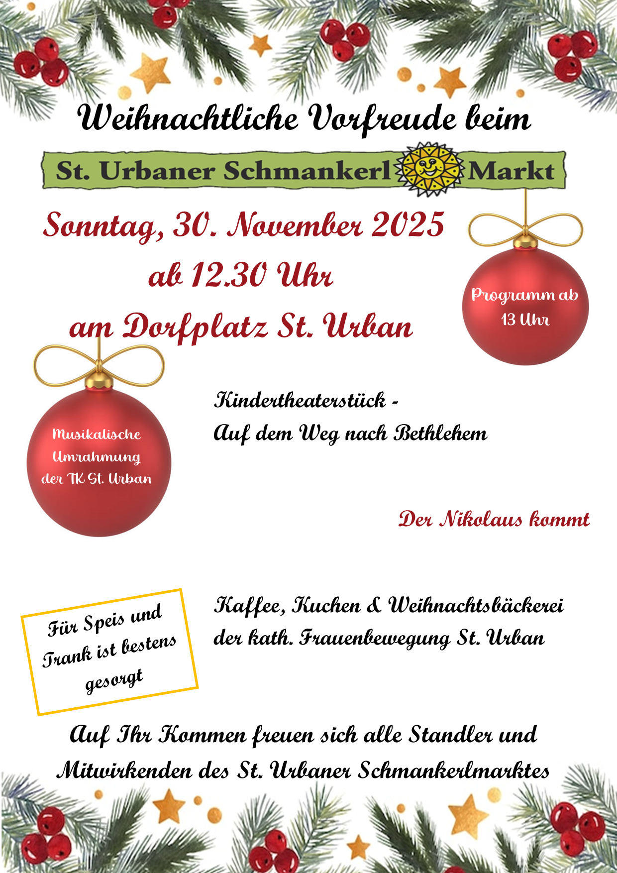 Am Sonntag, 30. November 2025 laden wir herzlich zum St. Urbaner Schmankerlmarkt am Dorfplatz ein – Beginn ist ab 12:30 Uhr! 🤩